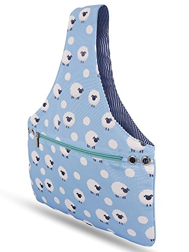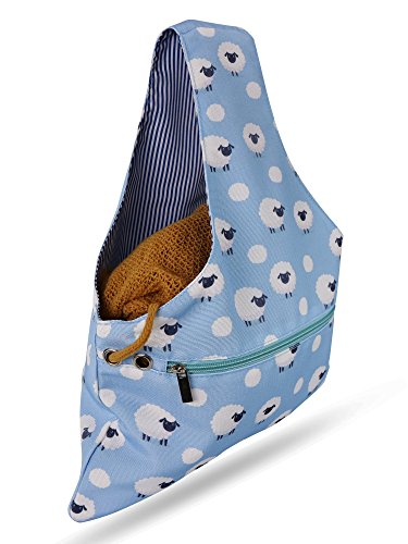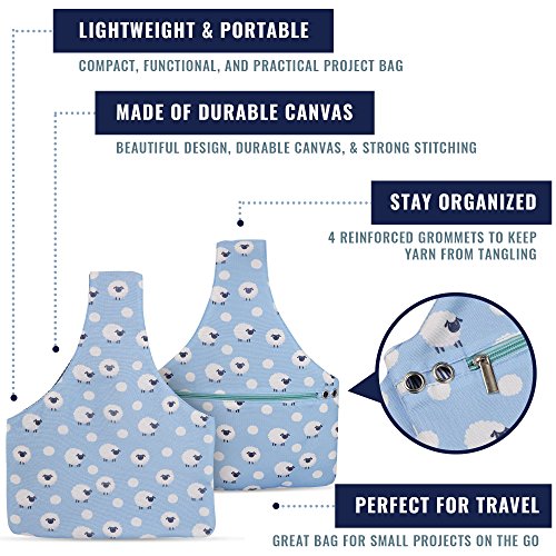 JamieCraft Yarn Bag – Portable, Light, and Easy to Carry Canvas Wrist Bag for Crochet and Knitting On the Go, Project Bag Holds Supplies and 14 Inch Needles or Hooks (Blue w/ Sheep)