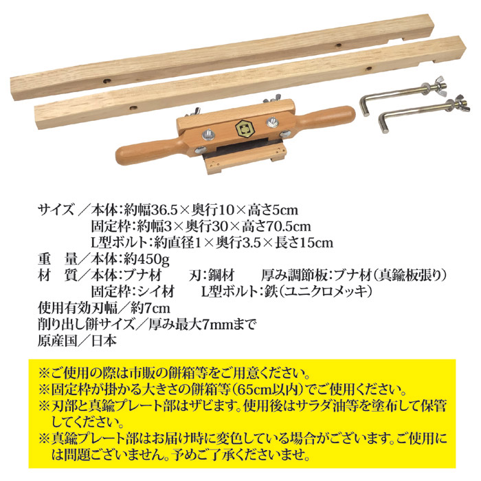 ●材質 本体:ブナ材 刃:鋼材 厚み調節板:ブナ材(真鍮板張り) 固定枠:シイ材 L型ボルト:鉄(ユニクロメッキ)