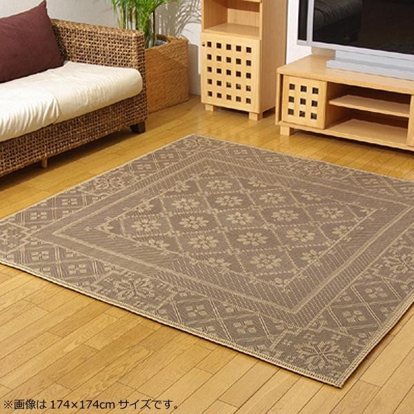 麻の一種であるジュート糸と、ポリエチレン糸のジャガード織のカーペットです。裏面にはフローリングを傷つけにくいよう不織布を貼っています。また、中材にはウレタンを使用しているのでクッション性があります。 |