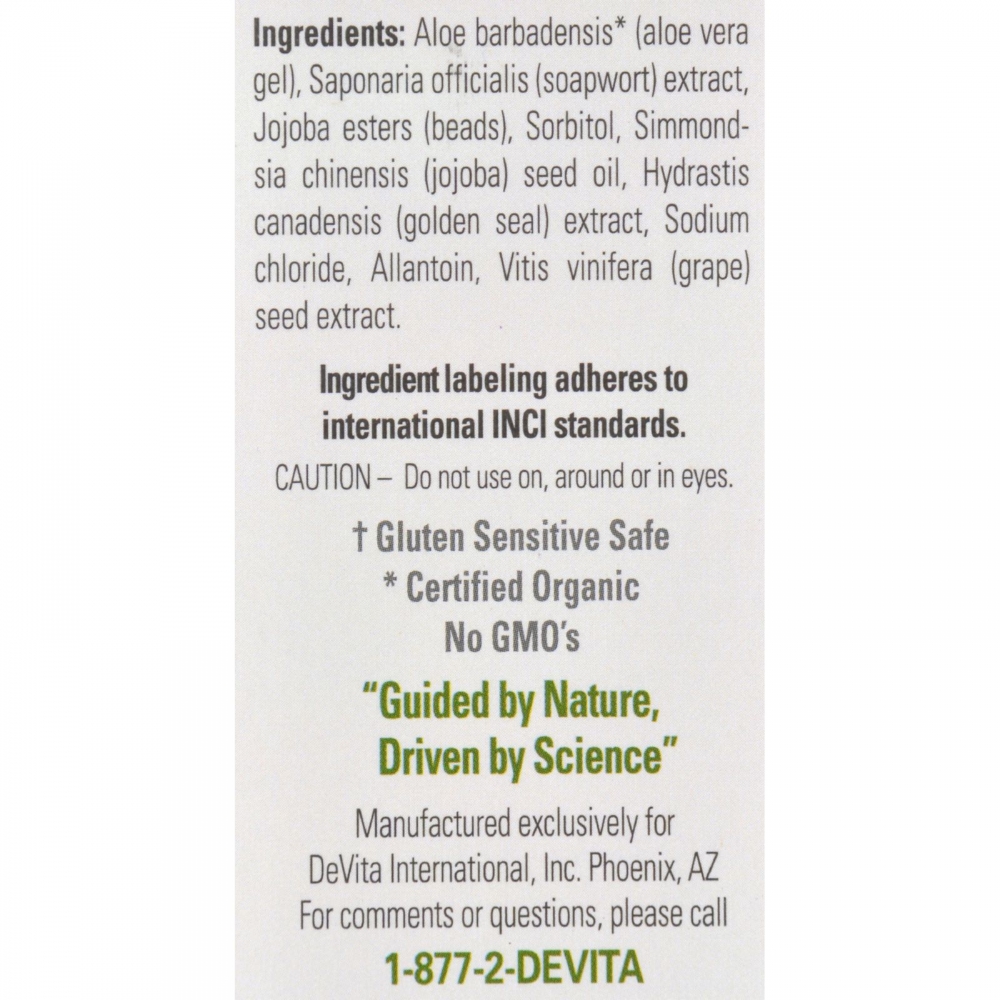 | Devita Gentle Aloe Facial Scrub Description: Natural Skin Care Paraben Free and 100% Vegan Off with the Old and On with the New... ...that's what your skin will seem to do! DeVita's all natural skin exfoliator helps gently erase off old, dead and dry surface cells with the silkiness of healing Goldenseal and 100% pure round Jojoba Beads, which will not tear the pores of skin (like salt and sugar scrubs can!). Helps improve the look of your skin texture and can increase the effectiveness of treatment serums and moisturizers. Leaves skin feeling smooth, and "new" as the appearance of healthy skin turn-over is encouraged. Free Of Paraben. gluten, gmos. Disclaimer These statements have not been evaluated by the FDA. These products are not intended to diagnose, treat, cure, or prevent any disease.Vegan : Yes Size : 7 OZ Pack of : 1 Product Selling Unit : each |
