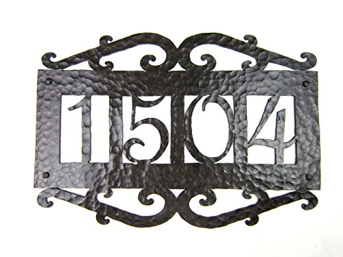-. Brand : Bushere and Son -. Feature : 4 number custom hammered iron address plaque. You choose your numbers / Old world hammered look and feel. / Made in USA. / 14 1/2"W x 10 1/2"T -. Label : Bushere and Son Iron Studio Inc. -. Manufacturer : Bushere and Son Iron Studio Inc. -. Model : APH14 -. PackageQuantity : 1 -. ProductGroup : Lawn & Patio -. ProductTypeName : OUTDOOR_LIVING -. Publisher : Bushere and Son Iron Studio Inc. -. Studio : Bushere and Son Iron Studio Inc. -. Title : Spanish Mediterranean Custom Hammered Wrought Iron Address Plaque APH14