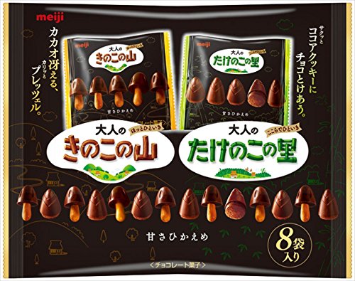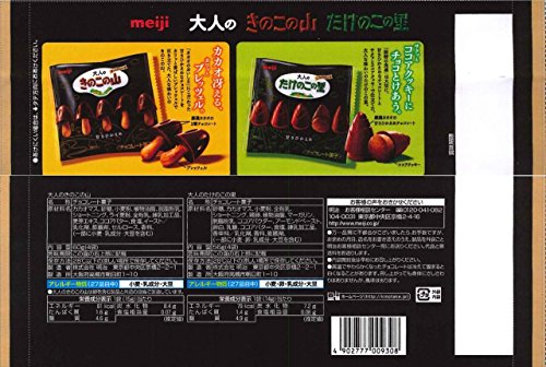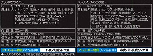 原材料:<大人のきのこの山>カカオマス、砂糖、小麦粉、植物油脂 、脱脂粉乳、ショートニング、ライ麦粉、全粉乳、練乳加工品、麦芽エキス、ココアバター、食塩、イースト/乳化剤、膨脹剤、セルロース、香料、(一部に小麦・乳成分・大豆を含む) <大人のたけのこの里>砂糖、カカオマス、小麦粉、全粉乳、ショートニング、鶏卵、植物油脂、マーガリン、脱脂粉乳、ココアパウダー、アーモンドペースト、卵白、乳糖、ココアバター、食塩、練乳加工品、香辛料/乳化剤、香料、膨脹剤、(一部に小麦・卵・乳成分・大豆を含む)
