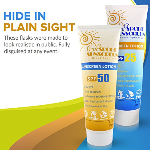 Sunscreen Flask was designed to look exactly like a regular bottle of sunscreen lotion, take your flasks anywhere. Your Bundle Includes 2 flasks labeled "SPF 25" and "SPF 50" so you can have 2 different kind of alcohol. They are 9.7 oz {XL} size compared to other brands and they can yield approx. 13 shots for both flask. given 1.5oz a shot of liquor. They are reusable and durable Food Grade Plastic and BPA Free. Please wash prior to usage. Included is a small funnel which fits perfectly on top of the opening and can be easily used to fill each container. Each bottle has a screw on cap providing an airtight seal but we have included 24 Safety Seals?for that Extra Protection from Leakage and Odor along with an Instruction card. "Mask your Flask" Suspicious eyes will never know you have booze inside. Easily, remove the seal and enjoy your choice of drink.? These covert flasks can travel with you on a cruise, golf course, to festivals, sporting games, clubs, parties, movies, where glass is restricted or forbidden like beaches and pools. They will pay for itself after one usage avoiding the extra liquor cost. They make a perfect gift for Christmas, Bachelor, Bachelorette, or even a nice gag gift like Secret Santa or White Elephant. These flasks are nice, portable and fun. Always remember to drink responsible. 0 |