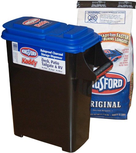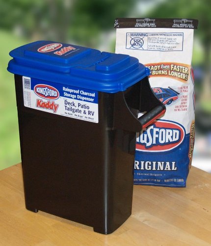 Charcoal dispenser designed to hold 12-pounds of bagged charcoal. This 4-gallon container features Buddeez' patented bag-gripper that provides for dispensing directly from the bag thus keeping charcoal dry and dust to a minimum. Great companion for its big brother the Kingsford Kaddy that holds up to a 24-pound bag of bagged charcoal.