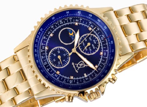 -. Title : Konigswerk Mens Gold Tone Bracelet Watch Multifunction Blue Dial Crystal Markers AQ101091G