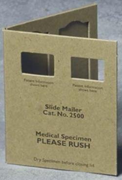 This 2-place slide mailer is made of strong and durable cardboard for transport of up to two slides safely and without extra effort. Mailer features a thumb groove for easy removal of the slides. It can be reused or recycled as a paper product. Capacity: up to 2 slides. Slide size: standard microscope 3 inches by 1 inches. Material: cardboard. Biologix Research Company #: 41-4002.Feature