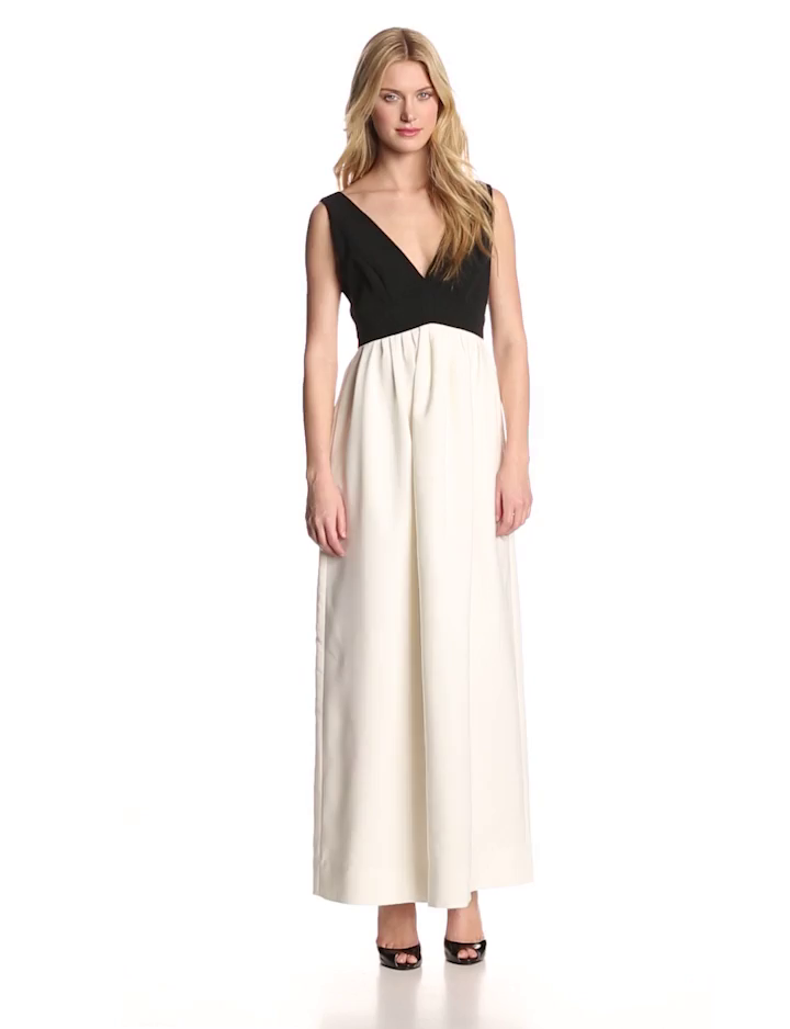 Sleeveless gown featuring black bodice with plunging V and pleated skirt with side pockets