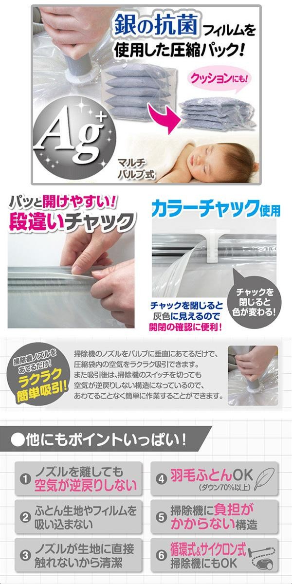 圧縮袋のフィルム内側に銀系無機抗菌剤を練り込んでおり、フィルム上の菌の繁殖を抑制します。ノズルを離しても空気が逆戻りしないオートロックバルブ式です。 |