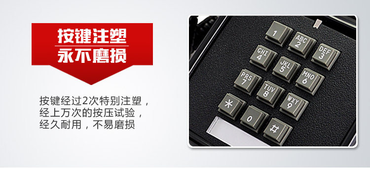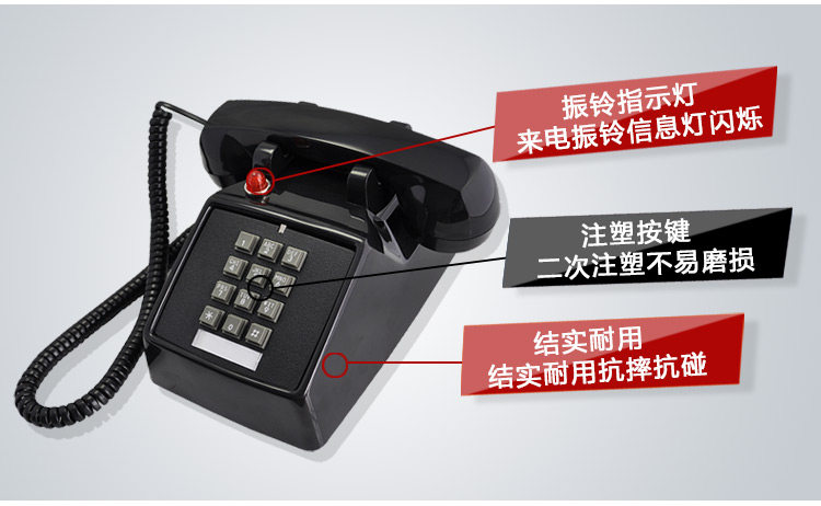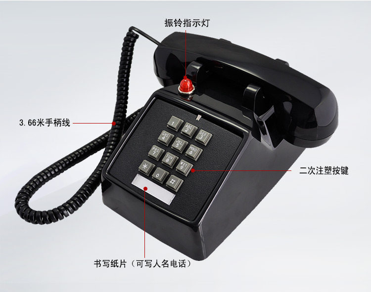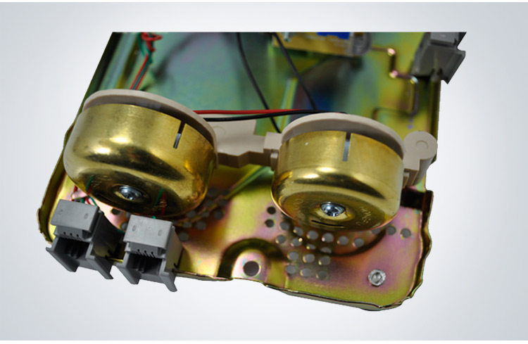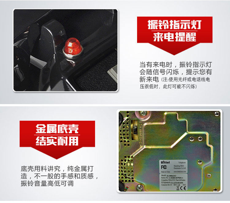 两个金属铃铛,古典怀旧的金属铃声就是从这么发出的金属底壳,来电振铃声音大小可调;品牌标志、3C、CE等质量认证。