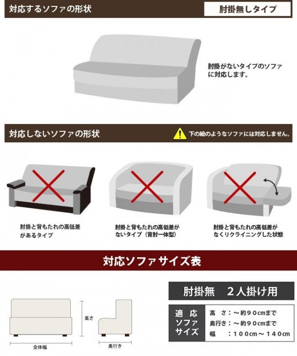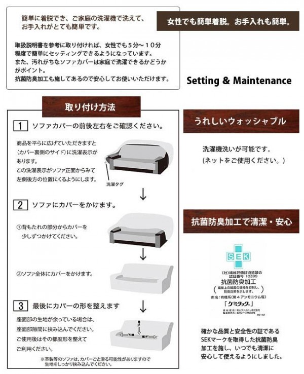 | 仕様 | 抗菌防臭加工(SEKマーク取得) ウォッシャブル(洗濯機洗い可能・ネット使用) 【適応ソファーサイズ】 高さ:~約90cmまで 奥行き:~約90cmまで 幅:100~140cm |