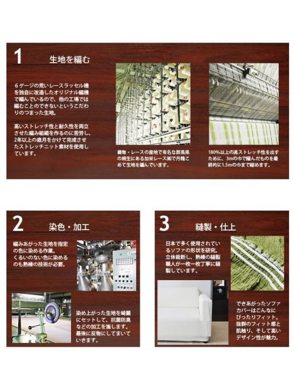 | 縦横自在に伸びて、ソファにぴったりフィットするソファカバー。ストレッチ性を極限まで高めたスーパーストレッチニット生地を使用。女性一人でも簡単に着脱ができる手軽さも魅力です。SEKマーク取得の抗菌防臭加工も施し、いつでも快適に愛用できます。ベーシックなカラーリングと挿し色を含めた6色展開。お部屋のイメージに合ったカラーをお選びください。日本製。 |