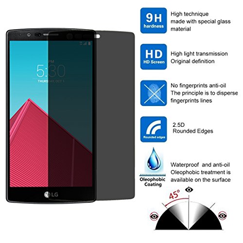 - Feature : Material:Treated tempered glass; Compatible for LG G5 / Visual Range: ≤45°, Anti-spy, Privacy protection from left and right view of your screen / 9H hardness, 0.33mm thickness, 2.5D rounded edge,Anti-fingerprint, shatter proof, high-response touch, Protects your screen from scratches, dust, scrapes, ware, blast and impact. / ATTENTION PLEASE: THE SCREEN PROTECTOR CAN NOT COMPLETELY COVER THE PHONE WHO HAS CURVED EDGE / Package Included: 1 x Anti-spy tempered glass ; 1 x Wet Wiper ; 1 x Dry Wiper; 1 x Dust-absorber (MACHINE NOT INCLUDED)