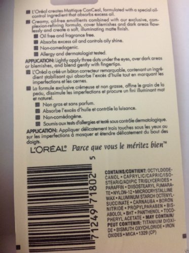 -. Feature : L'oreal Mattique Oil-free Concealer Cover-up Light Beige Clair Full Size. / Light Beige Clair .-FULL SIZE (SIZE 0.15 oz / 4.2 g). / COVERS BLEMISHES AND DARK AREAS FLAWLESSLY TO CREAT A SOFT,ILLUMINATING MATTE FINISH / ABSORB EXCESS OIL -BLENDS SMOOTHLY AND EVENLY . / OIL FREE AND FRAGRANCE FREE.