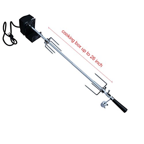 - Includes handle, counterbalance, roller, 2 4-prong meat forks, 31 1/2 ''×3/8'' square spit rod, motor bracket,110V electric motor,cooking box up to 26 inch.