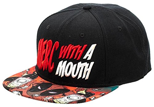 -. Binding : Apparel -. Brand : Marvel -. ClothingSize : One Size Fits Most -. Color : Black -. Department : unisex-adult -. EAN : 0646437663014 -. Feature : Officially Licensed Marvel Item / Brand New Item with Tags - Indiviually Wrapped / One Size Fits Most - Intended for Ages 14 and Older / 100% Authentic / Sublimated Bill -. PackageQuantity : 1 -. ProductGroup : Apparel -. ProductTypeName : HAT -. Size : One Size Fits Most -. Title : Deadpool- Merc With A Mouth Snapback Hat Size ONE SIZE -. UPC : 646437663014
