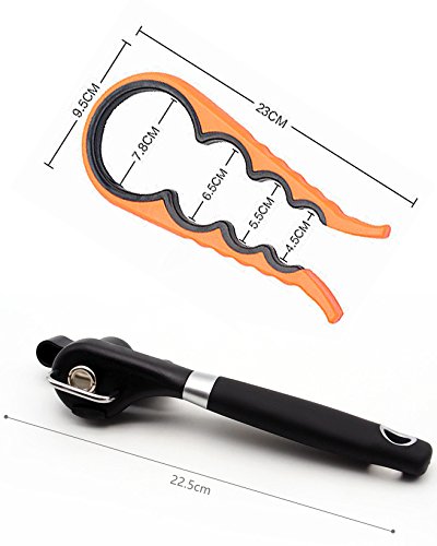 - ★ Size of mental can opener: 22.5cm (Length) * 6.0cm (Width) * 4cm (Height); Colour: Black **/** Size of 4-in-1 jar opener: 23cm * 7 cm; Colour: Orange. **/* *Black one has a big holes at the ends, orange one is open shape, so you can easily hang it up to save space