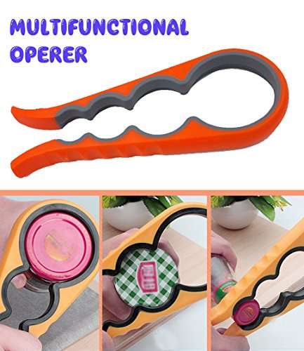 - ★ Attractive design: The can opener imparts the ultimate cooking experience. It has a stylish and attractive design in black and steel colors that looks great in every kitchen. **/** (4-in-1 Jar Opener) Solid and reliable design makes this multi-function kitchen aide easy to hold and handle. Different sizes of circular openings provide a secure grip for a wider variety of containers than metal tools. Non slip design works well with wet jars and hands