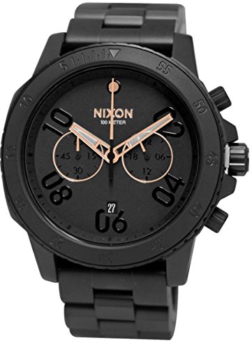 Studio : Nixon Publisher : Nixon Binding : Watch Product Description Nixon - Ranger Chrono - All Black / Rose Gold watch - When the horizon calls, Ranger Chrono is ready to answer. Rugged construction, stainless steel band, and a duel-eyed chronograph will keep you on time no matter how far from the trail you stray. Movement: Miyota Japanese quartz 5 hand chronograph with date function and crown placement at 4 o'clock - Dial: The dial features printed hour and seconds track on the concave ring, custom molded hands, applied 12 hour marker, a date window at 6 o'clock, and a 24 hour subdial at 3 o'clock. Chronograph function with second hand and a 30 minutes chrono subdial at 9 o'clock - Case: 44mm, 100 meter/10 ATM custom stainless steel case with hardened mineral crystal. Unidirectional stainless steel bezel, contrast plated stainless steel bezel insert with color fill countdown timer markings, custom screw bar lugs, stainless steel double gasket crown, and stainless steel screw down caseback - Band: 22mm custom solid stainless steel free-swing 3 link bracelet and solid stainless steel double locking clasp with micro adjust. 0