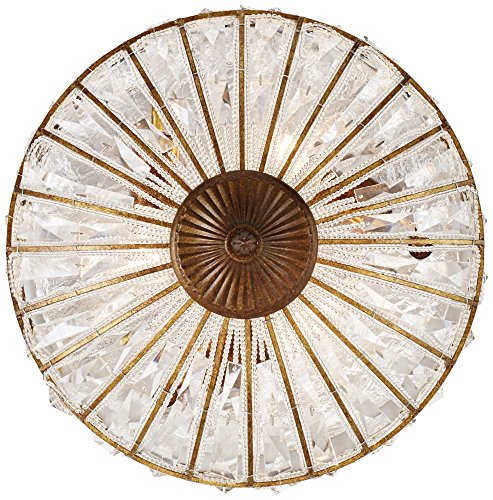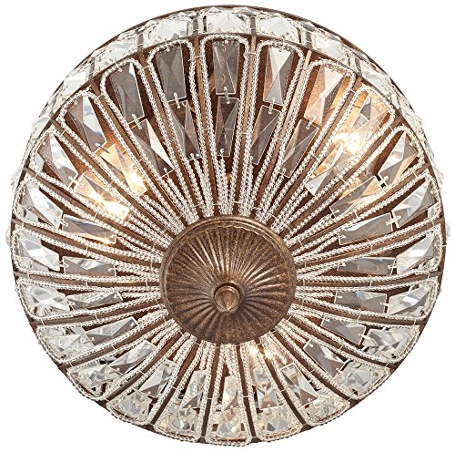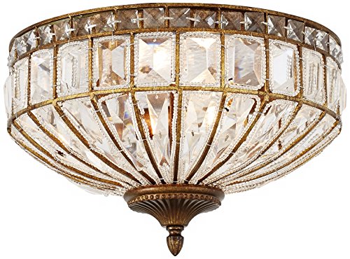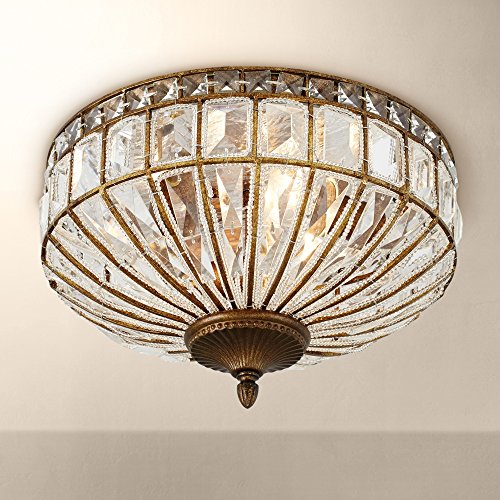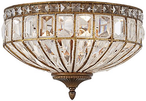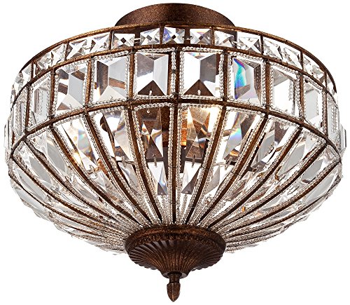 This impressive round flushmount ceiling light fixture has the look of an authentic antique. Square and rectangle faceted clear crystal glistens between a rich honey bronze finish metal frame, with a decorative finial. A three-light design that packs a stylish punch.
