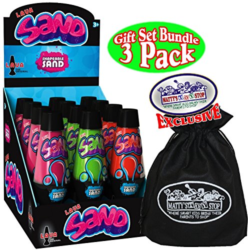 Schylling Lava Modeling Sand Green, Pink & Orange Gift Set Bundle with Bonus "Matty's Toy Stop" Storage Bag - 3 Pack, is AWESOME! Lava Sand is the squeezable sand where you can FEEL the fun! You've seen it before, but you've never felt anything like it! Pack it, pull it, shape it and love it, Lava Sand is so incredible you can't put it down. It's kinetic - meaning it sticks to itself and not to you! It oozes, moves and melts right before your eyes. It flows through your fingers like a slow-moving liquid, but leaves them completely dry. Lava Sand stimulates children's creative skills allowing them to create anything they can imagine over and over again. Lava Sand never dries out. This soft and stretchy sand easily cleans up while delivering non-stop fun! It's squeezable sand you can't put down. Feel the difference with Lava Sand! Makes a great gift & is perfect for schools, party favors, stocking stuffers, baskets, special needs, promotions and so much more! For Ages 3 and up - Fun for the whole family! - Matty's Toy Stop exclusive storage bag included!Feature