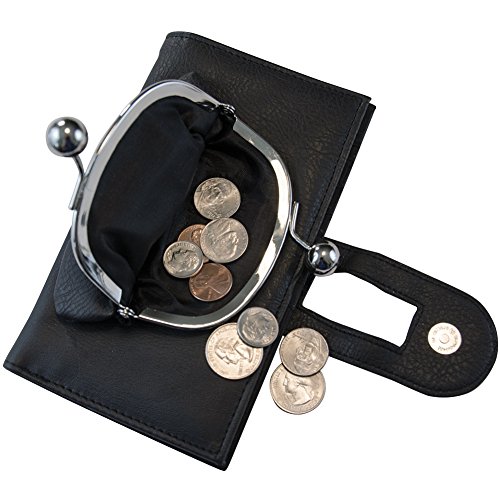 With ID window pocket; 11 card slots; 2 large compartments for cash and checkbook; 6 smaller compartments for receipts, tickets, etc.; exterior kisslock coin pouch; and magnetic close tab.