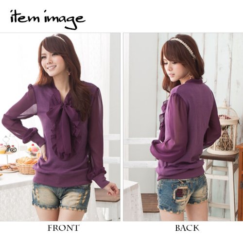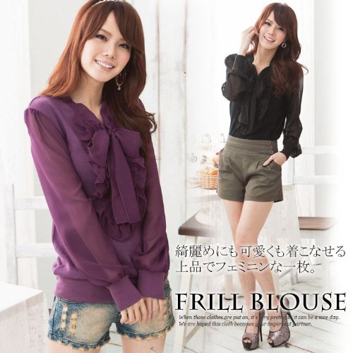 -. Title : (ゴールドジャパン)Goldjapan 大きいサイズ レディース ブラウス トップス 長袖 シースルー リボン フリル パープル ブラック