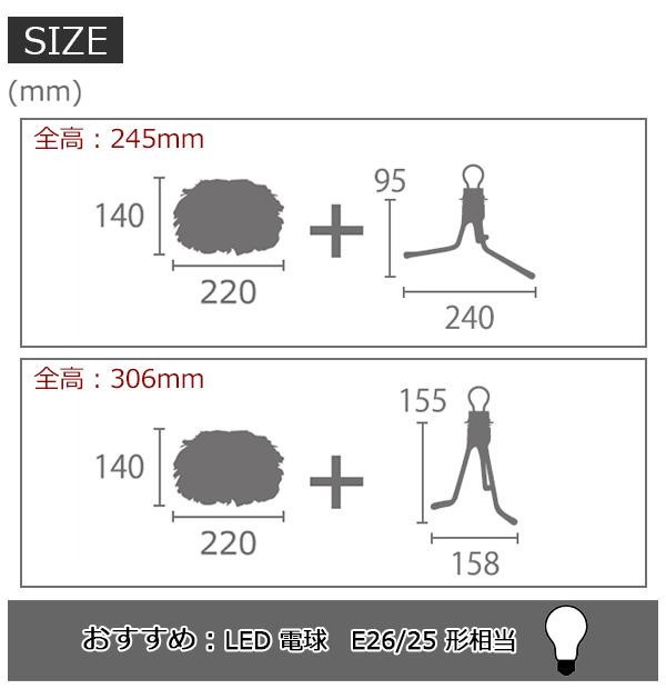 | 仕様 | 組立式 定格電圧:100V 50/60Hz 点灯:中間スイッチ(コンセント) 電球:E26/40形相当(LED/1個)※別売 |