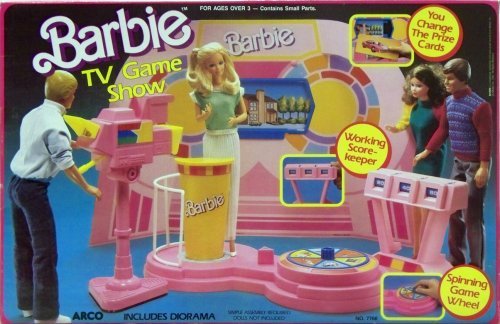 -. Feature : Barbie TV Game Show is a 1987 Arco Toys, Mattel production Playset. / Includes: Base, TV Camera, Working Score Keeper, Podium, Railing, Game Frame & 3 Game Cards, Spinning Game Wheel & a ama. You can change the P.R.Ize Cards! The Score Keeper Works! / SIMPLE ASSEMBLY REQUIRED. For Ages 3+ Years. Colors, styles, sizes & info may vary. CAUTION: Small Parts included. / Included items are pretend & intended for Barbie & other 11.5" fashion dolls; dolls NOT included. Playset can be used with other size dolls, as preferred. / for ages 3+ Years. For Box Condition see CONDITION NOTE or Email Seller for Details.
