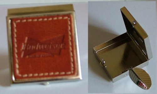 -. Feature : Square compact travel ashtray / Flip out arm / leather embossed Budweiser logo
