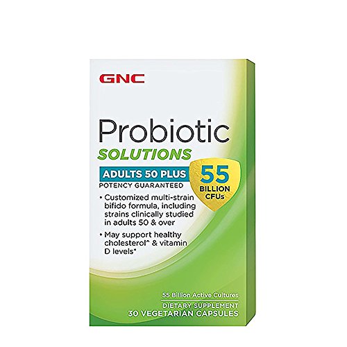 -. Binding : Health and Beauty -. Brand : GNC -. EAN : 0048107170448 -. Feature : Multiple strains of live, active probiotic cultures / Customized bifudo formula, including strains clinically studied in older adults / Replenishes friendly bacteria that decreases with age. / Clinically studied strain that may support healthy cholesterol levels, and emerging research sests it may also support improvements in Vitamin D levels. / May provide digestive and immune support -. Label : GNC -. LegalDisclaimer : WARNING: Keep out of reach of childrenGarder hors de la porée des enfants. Garder produit a une température et humidité ambiante. -. Manufacturer : GNC -. MPN : 424564 -. PackageQuantity : 1 -. PartNumber : 424564 -. ProductGroup : Health and Beauty -. ProductTypeName : HEALTH_PERSONAL_CARE -. Publisher : GNC -. Size : 30 servings -. Studio : GNC -. Title : GNC Probiotic Solutions Adults 50 Plus 30 Vegetarian caps -. UPC : 048107170448