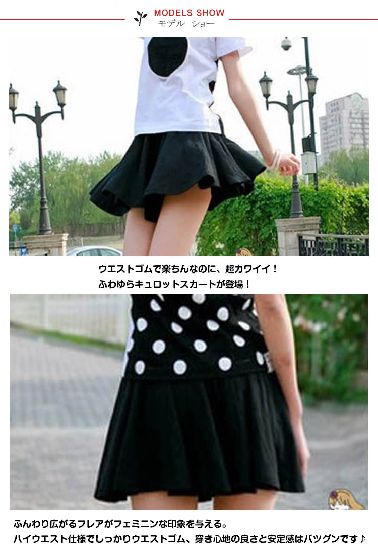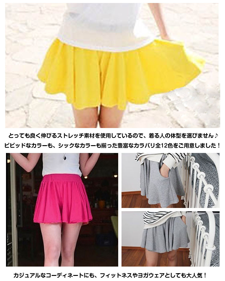 | ウエストゴムで楽ちんなのに、超カワイイ!ふわゆらキュロットスカートが登場!ふんわり広がるフレアがフェミニンな印象を与える。ハイウエスト仕様でしっかりウエストゴム、穿き心地の良さと安定感はバツグンです♪とっても良く伸びるストレッチ素材を使用しているので、着る人の体型を選びません♪ビビッドなカラーも、シックなカラーも揃った豊富なカラバリ全12色をご用意しました!カジュアルなコーディネートにも、フィットネスやヨガウェアとしても大人気! | |