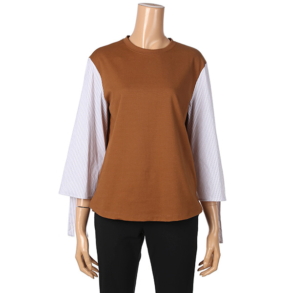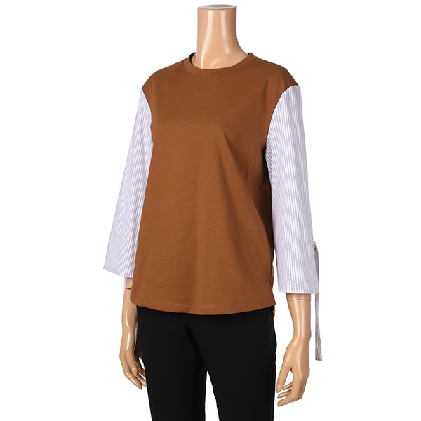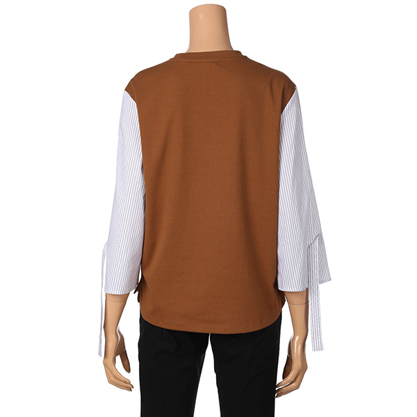 | 베이직한 기본 라운드 넥 티셔츠 디자인에 세련된 스트라이프 패턴 원단을 믹스해 포인트를 준 제품입니다. 앞모습과 뒷모습이 전혀 다른 외관을 보여주는 유니크한 스타일링을 즐기실 수 있습니다. 7부로되있으면 소매에 리본장식으로 소재감이 두껍지 않아 가을 시즌 부터 겨울시즌 이너로 착장이 가능합니다. | |