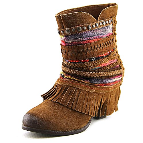 -. Feature : Burnished-toe boot featuring mid-calf shaft wrapped in braided fabric and fringe with tie-up corset back / Antiqued studs at scalloped topline / Low fringe / Stacked block heel