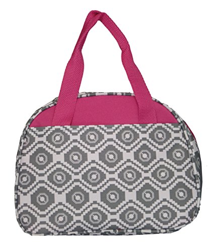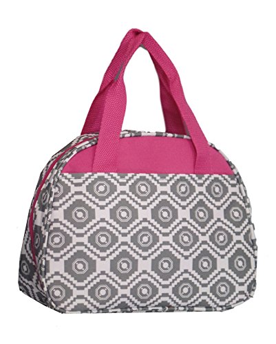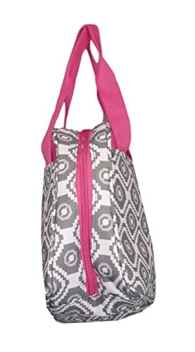 Fashion Print Insulated Water Resistant Round Small Lunch Cooler or Cosmetic Tote Bag (Grey Geometric with Pink Trim)