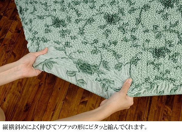 きめの細やかな縫製のシャーリング製法により、ソファへのフィット感は抜群!!アネモネのフラワーデザインと爽やかなグリーンカラーがお部屋の雰囲気を明るくします。立体的な仕上がりで、多くの袖付きソファにピッタリとフィットし、裾はスカートデザインで優しい表情が素敵です。洗濯機で丸洗い出来ます。 |
