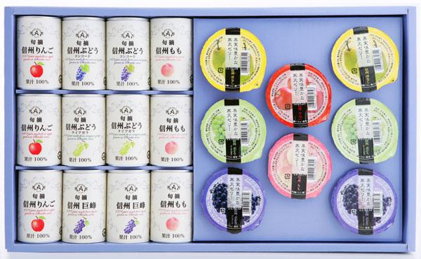 | セット内容 | ●信州ストレートジュース(160g) りんご・もも各3缶 コンコード・ナイアガラ・巨峰各2缶 ●信州フルーツゼリー(80g) コンコード・ナイアガラ・洋なし各2個 りんご・もも各1個 |