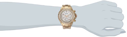 Rose gold-tone base metal case and bracelet. Two rows of genuine crystals bezel. White mother of pearl dial with rose gold-tone hands and Arabic hour markers. Dial Type: Analog. Luminescent hands. Date displayed at 4:30 position. Quartz movement. Scratch resistant mineral crystal. Push/pull crown. Screw-down case back. Case diameter: 40 mm. Case thickness: 10 mm. Round case shape. Band width: 20 mm. Band length: 8.5 inches. Push button deployment clasp. Water resistant at 10 meters (33 feet). Functions: chronograph, date, hour, minute, second. August Steiner Rose Gold-tone Ladies Watch AS8031RG.Feature