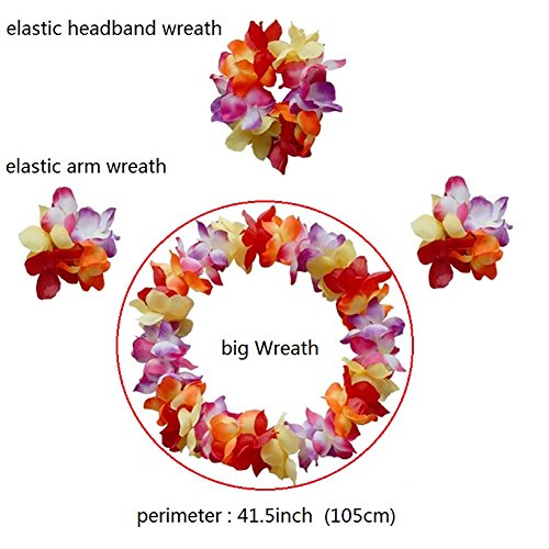 - This product includes:hula skirt * 1,head wreath * 1,Big wreath * 1,wrist wreath * 2,bra * 1