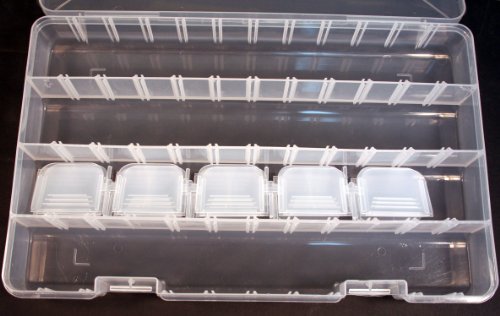 Studio : Wholesale Craft Outlet Publisher : Wholesale Craft Outlet Binding : Toy Product Description See thru plastic storage organizer case for loom bands and other small parts. Compartments are adjustable with the 20 included dividers. compartment rows are 2 inches wide x 1.9 inches deep and 13-1/2 inches long maximum. Durable shatter resistant plastic with 2 clasps on front to keep it closed. 14" x 8.5" x 1.9" overall. Made in USA! 0