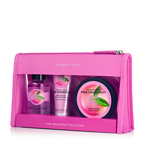 - Bath and body gift set of travel size treats from the Body Shop's revitalizing Pink Grapefruit range