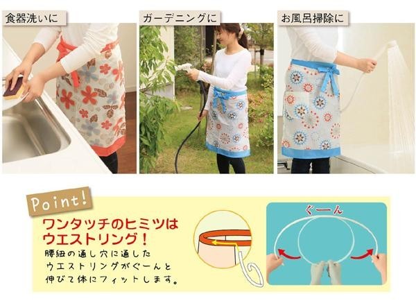 | ウエストリングが体にフィットしてずり落ちない♪ワンタッチ取り付けタイプのエプロンです。ウエスト周りは最大110cmまで対応!! |