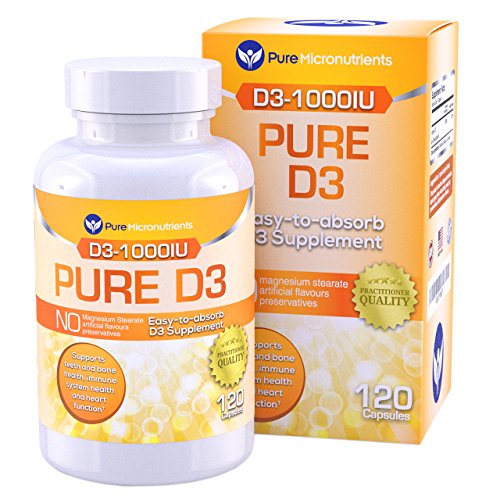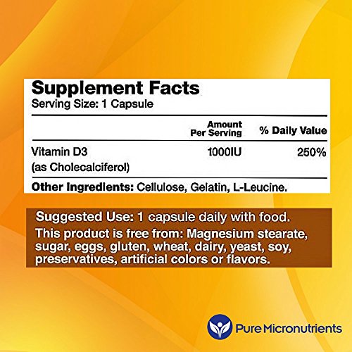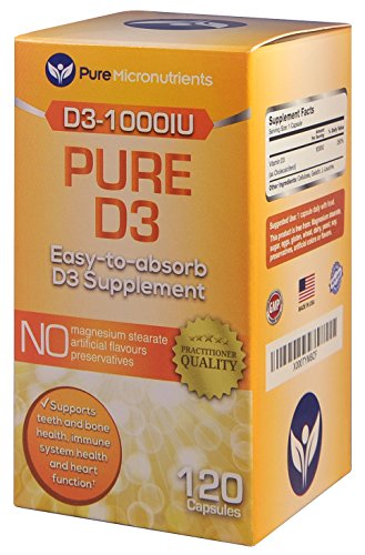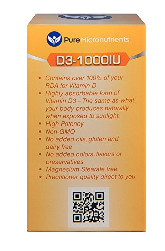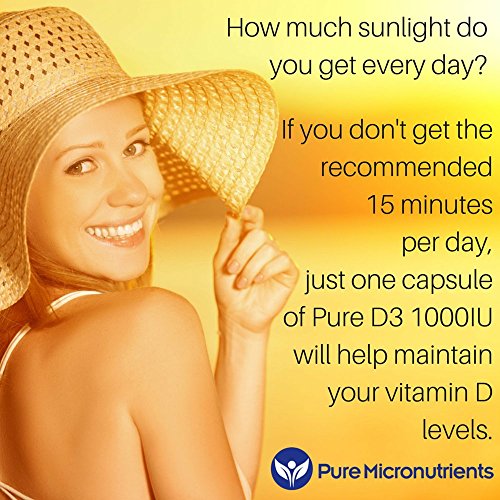 -. Feature : USA Made. Practitioner Quality Vitamin D3 1000IU supplement is an easy to swallow capsule that is gentle on the stomach / Vitamin D3 (Cholecalciferol) is clinically proven to be a highly absorbable form of Vitamin D, the same type that is produced by your skin from sun exposure, improving serum d levels naturally. † Pure Micronutrients Vitamin d3 supplements are available in 5000IU and 1000IU strengths / Non-GMO and Free from added Oils, Magnesium Stearate, Sugar, Salt, Dairy, Yeast, Preservatives, Artificial Colors or Flavors / Perfect D3 vitamin supplement for men, women, elderly, pregnant women, & teenagers / Vitamin D is essential for bone development, muscle strength & function, skin and dental health. Vitamin D boosts the immune system, promotes healthy cell replication, supporting optimal cardiovascular function and helps regulate moods. Ideal if you suffer from or are at high risk of Osteoporosis, Osteomalacia, high blood pressure, muscle aches and pains, heart attack, etc.† Customer Promise - 60 day MONEY BACK GUARANTEE!