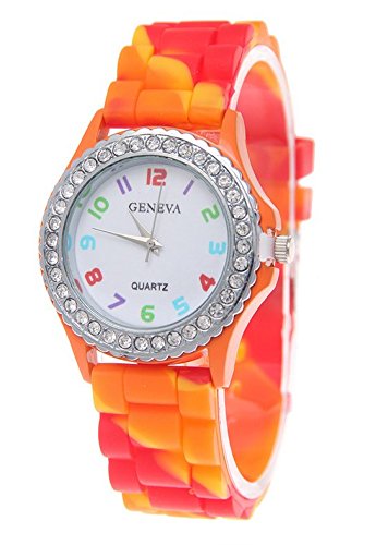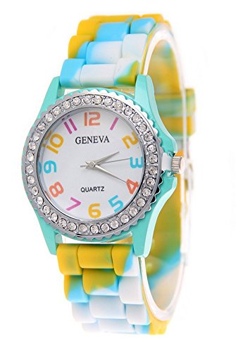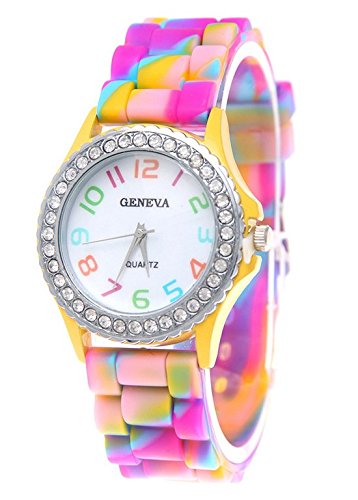 -. Feature : Colorful silicone brand watch strap provide comfortable wearing experience,beautiful and fun rainbow colors to brighten up your day. / Casual dress code design with rainbow colors, lead you to classic simplicity fashion. / Perfect for all kind of casual, advertisement,indoor activities or daily use,a great gift for women ladies girls. / Band Material: Silicone / Package: Fiiliip Geneva Rainbow Silicone Watch x 6