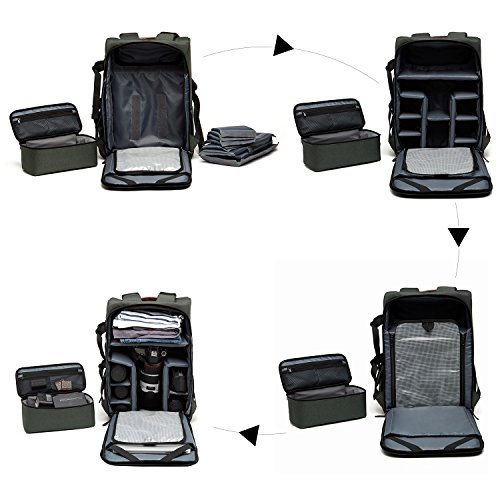 -. Feature : Dimensions: 12.59"L x 17.3"H x 6.3"W; Fully convertible from an everyday backpack into a DSLR camera travel bag by taking out the center compartment. / This professional backpack has two main compartments, the upper one is for storing clothing, The lower compartment with removable customize padded divider set that allow you to hold one DSLRs with about 3-6 lenses. / The separate padded compartment for 15.6" laptops/notebooks, tablets, books and more. Side and Front Compartments for Easy & Quick Access to camera and accessories like battery, cable, lenscap or cellphone storage. / The heavily padded shoulder straps and wide, adjustable waist and chest straps make the backpack comfort on the go. The exterior also features a tripod holder. / Include a rain cover, concealed in the bottom zippered bag for unexpected weather. You can also use it as carry on while travelling.