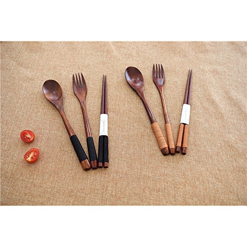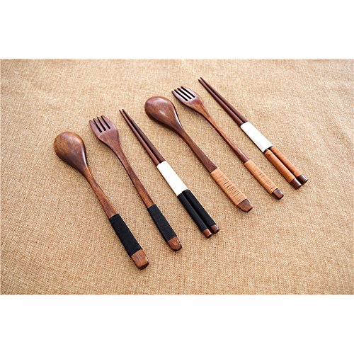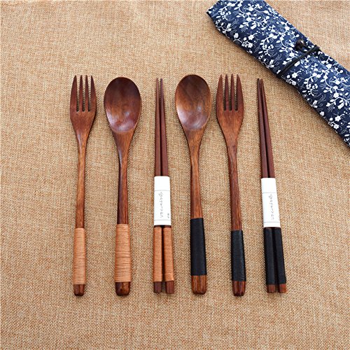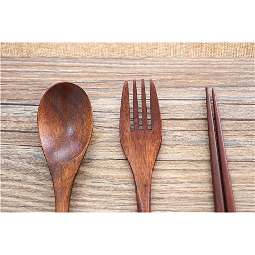 ZoCr Natural Wooden Flatware Sets of 3-pieces (1 Spoon, 1 Chopsticks, 1 Fork) Packaged with Tableware Bag for Camping, Travel, Picnic,Office or Home (ZoCr-117)