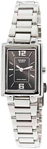Brand, Seller, or Collection Name:Casio Model number:LTP-1238D-1A Part Number:LTP-1238D-1A Item Shape:rectangle Dial window material type:Mineral Display Type:Analog Clasp:Fold-Over Clasp with Single Push-Button Safety Case material:Stainless steel Case diameter:21 millimeters Case Thickness:7 millimeters Band Material:Stainless steel Band length:Women's Standard Band width:16 millimeters Band Color:Silver Dial color:Black Special features:measures-seconds Movement:Quartz Water resistant depth:50 Meters