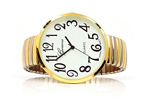 Brand, Seller, or Collection Name:Geneva Model number:SPR2TN63 Part Number:FTW Item Shape:Round Display Type:Analog Case diameter:1.70 inches Band Material:Metal Band width:0.75 inches Band Color:Silver Gold Dial color:White Special features:Large Case, Stretch Band Movement:Japan Quartz Movement