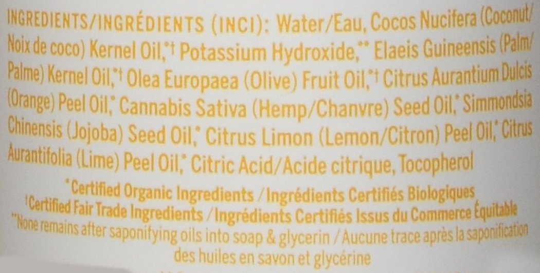 Water, coconut fatty acid K, glycerin, olive fatty acid K, perfume (essential oil), hemp seed oil, jojoba oil, vitamin E, citric acid