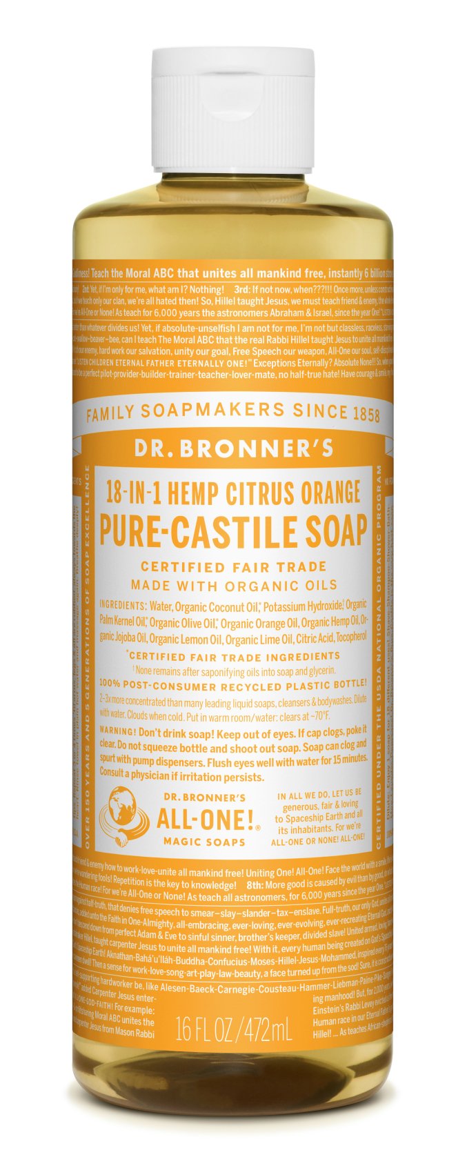 On the label of Magic Soap, Emmanuel Bronner's world peace and a thought for environmental protection are densely written.