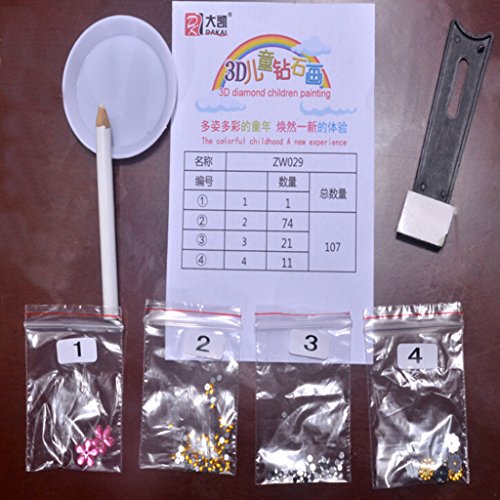 -. Feature : Colorful rhinestones with diamond-like luster, a pencil is convenient for sticking rhinestones, a plate for putting rhinestones together. / Follow the number, stick the rhinestone on the cartoon PVC sticker borad, very easy and fast for kids to finish the beautiful painting, also good for DIY. / When kids finish the pianting, use the sticky stand to dispaly it. / A perfect gift and toy for kids, also a great thing to make fun. / Material: PVC,Rhinestone.